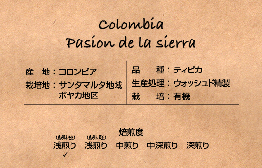 スペイン語で”情熱の山脈”を意味する「パシオン デ・ラ シエラ」。その名の通り海抜2,000メートルもの高地の厳しい環境で、栽培しているナブシマケ村の集落はわずか50家族ほどということ。当然、近代的な手入れは望めないため、半野生的な栽培を行っているようです。ティピカは、ブルーマウンテンと同じ品種。野生種あふれる100%ティピカはとても珍しいです。